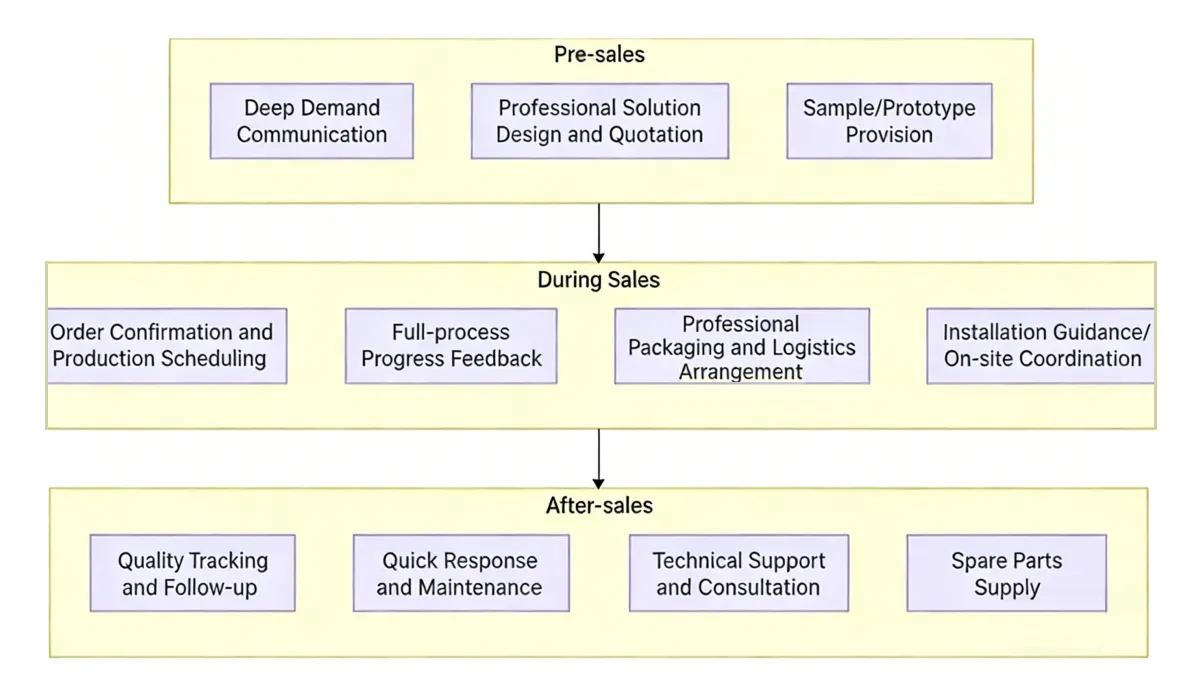 অর্ডার নিশ্চিতকরণের পরে, YeHaoXuan একটি উত্সর্গীকৃত উত্পাদন সময়সূচী শুরু করবে, আপনাকে রিয়েল টাইমে অগ্রগতি ট্র্যাক করার অনুমতি দেবে; উত্পাদনের পরে, আমরা পেশাদার প্যাকেজিং এবং নির্ভরযোগ্য সরবরাহ ব্যবহার করি এবং মসৃণ পণ্য সরবরাহ নিশ্চিত করতে ইনস্টলেশন নির্দেশিকা এবং প্রয়োজনীয় অন-সাইট সহায়তা প্রদান করি।